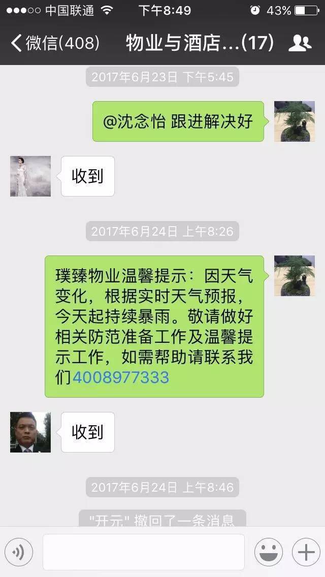 6月30日起的暴雨让普瑞物业公司的物业服务工作经受了考验。其中,璞臻分公司泊富国际大厦项目部作为大型综合体的服务方,在暴雨来临前,由客服部通过公告、微信朋友圈等多种方式提前发布暴雨预警提示,温馨提醒业主注意出行安全。项目负责人王志华副总经理第一时间召集项目相关人员制定防汛计划和险情预案,从6月30日起,24小时设备监测巡查,24小时清洁保洁维护到位,同时根据经验,提前在车库出入口设立了防洪挡板、防洪沙包,对倒灌进入的雨水启动抽水泵进行抽取。随时清理积水。在雨势最大的6月30日、7月1日确保各处无积水,保障业主财产不受损害。
