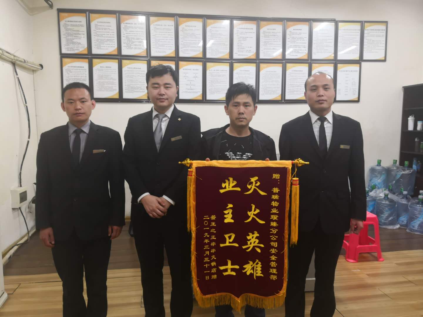 3月28日晚9点53分,泊富国际广场消控中心接到商铺紧急电话,称商铺电线短路并有明火,请紧急增援。当班监控员曹勇立刻使用对讲机通知义务消防员罗正杰和官鹏携带防烟面罩及干粉灭火器紧急增援,并通知当班领班甘默新、消防主管陶兴、安全管理部经理陈庆,项目副总经理王志华及工程部值班人员相关情况。两名义务消防员作为第一梯队赶往现场进行灾害处理,当班领班连同治安组人员李金沙作为第二梯队赶往现场对现场进行警戒和疏散,消防主管立刻带领宿舍下班人员作为第三梯队立刻赶往项目进行增援。灭火组在9:54分抵达现场,立刻手动关闭电源总闸,并佩戴防烟面罩,使用干粉灭火器对明火现场进行灭火,9:55分,工程部值班人员、第二梯队及第三梯队所有人员全部抵达现场,进行现场警戒,电力排查、工作人员疏散,烟雾排除、信息公关等工作,9:57分,明火被扑灭,工作人员已疏散到门口,烟雾已散尽。各梯队按照项目消防制度中火灾处理流程,全部在指定时间内抵达现场进行处理,并有效控制险情。该商铺店长为感谢义务消防员的及时灭火,制作了锦旗对安全管理部进行感谢。